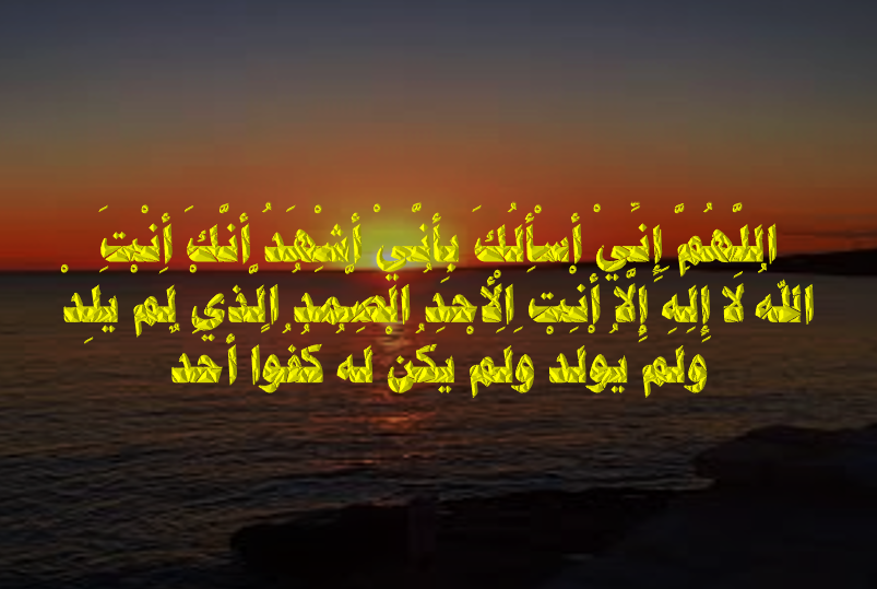 “عن بريدة بن الحصيب الأسلمي قال: سَمِعَ النبيُّ صلى الله عليه وسلم رجلاً يدعو وهو يقولُ: اللهم إني أسألُك بأني أشهدُ أنك أنت اللهُ لا إلَه إلا أنتَ الأحدُ الصمدُ الذي لم يلدْ ولم يولدْ ولم يكن له كُفُوًا أحدٌ. قال فقال والذي نفسي بيدِه لقد سألَ اللهَ باسمِه الأعظمِ الذي إذا دُعيَ به أجابَ وإذا سُئِلَ به أعطى” [رواه الترمذي].